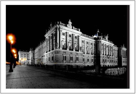 La fotografía empleada por Don Juan Carlos y Doña Sofía es una imagen del Palacio Real de Madrid iluminado en la que se ha empleado una técnica de color selectivo para dejar toda la imagen en blanco y negro con excepción de las farolas que conservan el color amarillo dorado de su incandescencia.