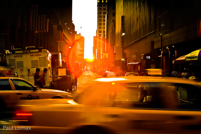 Manhattan, uno de los cinco distritos metropolitanos de Nueva York, tiene un trazado urbanístico en cuadrícula con las avenidas en alineación norte-sur y las calles este-oeste. Por esa razón, una vez al año, durante tan solo dos días, la puesta de sol se alinea perfectamente con la cuadrícula y crea oportunidades fotográficas interesantes en las que la cálida luz del atardecer atraviesa las calles, e incluso el gran astro anaranjado les pone broche, ofreciendo un fantástico cocktail que mezcla lo natural y lo urbano.