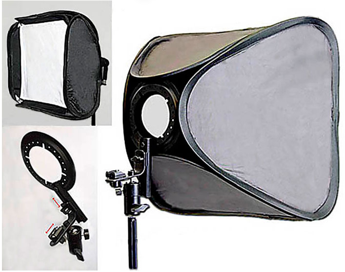 Los perfiles de la ventana están hechos con flejes de acero lo que permite doblarnos (como se hace con los reflectores circulares) y plegar la ventana para meterla en una pequeña bolsita muy fácil de transportar en la que también se mete el soporte para el flash y la arandela de ajuste para sujetar la ventana. El adaptador tiene dos zapatas ajustables tanto en altura como en longitud por lo que prácticamente se puede acoplar cualquier flash.
