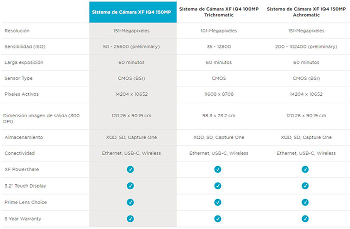 Este es el caso de la nueva Phase One IQ 4 150 MP. Se trata de una cámara de formato medio, por supuesto de objetivos intercambiables, que puede montar tres respaldos diferentes que salen simultáneamente a la venta. Dos modelos son de 150 megapíxeles diseñados por Sony BSI-CMOS (IQ4 150MP e IQ4 150MP Achromatic) y el tercero es Tricromático de 100MP.