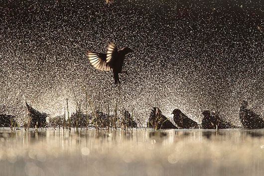 Las fotografías ganadoras que se pueden ver en este post, incluyen un bando de estorninos bañándose en la salmantina laguna del Cristo, trabajo del fotógrafo Mario Cea premio “Aves de España”. El fulmar boreal recortado sobre una cascada en Islandia, obra de José Manuel Grandio, premio “Aves del mundo” y el paisaje de tundra en Alaska en el que destaca la figura de un alce, trabajo de Javi Montes Malagón galardonado con el premio “Biodiversidad del planeta”.