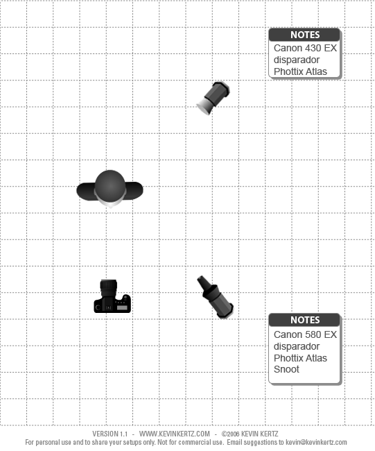 Muchísimas gracias por la respuesta. El reflector no me cuadraba porque es el mismo tipo de luz que la del lado derecho, a no ser que hubiera sido uno tipo plata muy pulido. Lo del flash 430EX tampoco me cuadraba por los 45º a los que esta dibujado en el esquema. Imagino que estaría casi trasero con una ligera inclinación hacia el lado derecho, pero no creo que fueran 45ª como en el dibujo. También supongo que estuviera algo cenital o muy elevado por la luz superior del hombro.