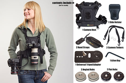 Chalecos o arneses. Son la opción más cara pero algunos suponen una solución inigualable para situaciones como por ejemplo la escalada. Quizás el más reseñable del mercado es el de Cotton Carrier. El diseñado para llevar dos cámaras nos permitirá llevar una en la cintura y la otra firmemente en el pecho. Este es un ejemplo de uno de los líderes del mercado Cotton Carrier .