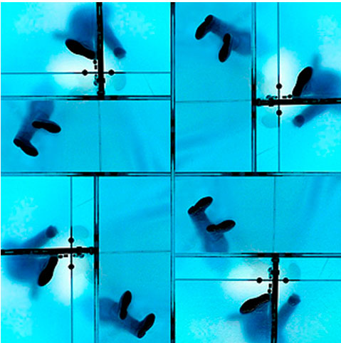 A través de la contemplación de su trabajo Escenografías, nos invita a recorrer con la mirada lugares reinventados, en los que resuenan los rasgos reconocibles de los edificios históricos, junto a las geometrías que forman los andamiajes y los telones que los cubren. En otros trabajos, nos induce a cambiar los muros opacos y los andamiajes por las Transparencias que procuran los cristales translúcidos de las arquitecturas actuales.