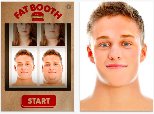 El programita FatBooth, disponible para iPhone y para Android, es sencillo. O tomas una foto con el móvil en el momento o usas una que ya tuvieras hecha de antemano y el programa la edita automáticamente. Como suele ocurrir con los programas de retoque automático, necesita que le digas dónde están los ojos, la boca y la barbilla. A partir de ahí, alimenta tu retrato con unas cuantas hamburguesas y voilá, el retratado aparece como nunca querría verse.
