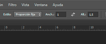 - Mantener la proporción de la foto. Si deseas que el hueco destinado a una fotografía respete las proporciones de ésta, lo primero que hay que hacer es hallar la proporción entre el alto y el ancho. Para ello, divide el lado mayor por el menor y el producto de la división será la relación de la proporción respecto a 1. Por ejemplo, para una foto de 40 x 60 mm. Dividimos 60 entre 40 y nos da 1,5. La proporción es de 1:1,5 o 1,5:1 según si la foto es vertical u horizontal. Luego, conocida la proporción, lo que hay que hacer es ir a las opciones de la herramienta marco rectangular (barra superior) seleccionar Estilo>Proporción fija y rellenar el Ancho y el Alto con los número correspondientes a la proporción. Para saber el tamaño de tu imagen ve a Imagen>Tamaño de imagen.