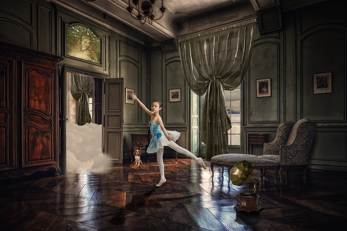 Ajuste de color. Para que el color de la bailarina se integre con el del salón, hacemos una copia del fondo a la que le aplicamos el filtro de desenfoque Media. Eso da como resultado un color uniforme que vamos a poner sobre la bailarina como capa de recorte y con un modo de fusión Color y una opacidad reducida.